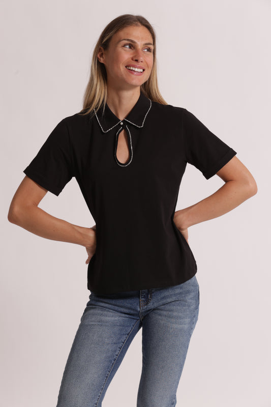 T-SHIRT CON SCOLLO A GOCCIA E RIFINITURA STRASS