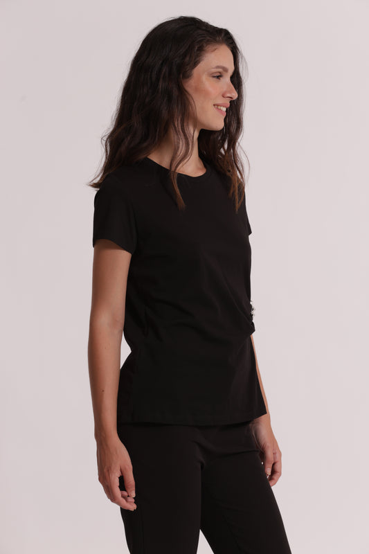 T-SHIRT CON ARRICCIO LATERALE E SPILLA DI STRASS